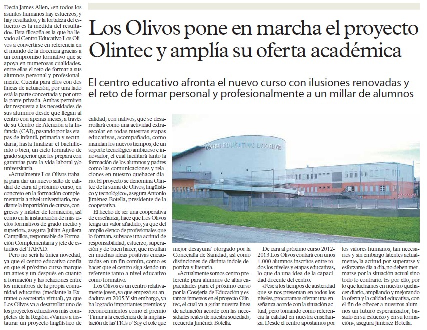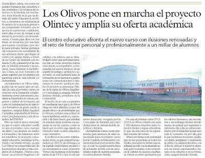 Premio "Soy el cole que mejor desayuna" Fundación Kellog´s Premio "Mención de Honor a la excelencia en la implantación de TICS" Proyecto Olintec (Olivos LINguístico y TECnológico) Centro Preferente de Altas Capacidades de la Región de Murcia Implantación del Sistema de Calidad CAF Educación |
