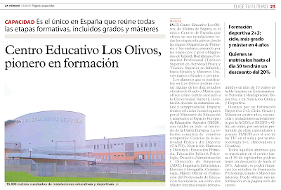 - INFRAESTRUCTURA exclusiva y acorde a las necesidades, tanto teóricas como prácticas, que nos permiten desarrollar de forma coherente, constructiva y significativa el currículo establecido para estos estudios. - Rodeado de un ENTORNO NATURAL propicio para el desarrollo de actividades medioambientales. - COLABORACIÓN directa con el Ayuntamiento de Molina de Segura (Concejalía de Deportes), Empresas privadas y con las federaciones deportivas españolas, elaborando anualmente una gran variedad de CURSOS FORMATIVOS para fomentar y completar el currículum de nuestros alumnos durante su estancia en el centro, muchos de los cuales ya van incluidos en la matrícula. Preparación para los exámenes de la escuela de idiomas (B1 y B2) y de Cambridge. Entre los cursos Federativos ofertados tenéis: Monitor de Natación, Socorrista Acuático, Socorrista: especialista en parques acuáticos (bolsa de trabajo propia), Especialista en RCP y DESA (por la concejalía de sanidad), Instructor de Pádel, Entrenador Personal, Entrenador Personal en el medio acuático, Evaluación Integral del Deportista I y II, Acondicionamiento Físico, Prevención de lesiones y Readaptador Deportivo, Entrenamiento Funcional (avalado por la TheraBand Academy) etc. Dicha formación, garantiza una inserción al mercado laboral con garantías adquiriendo unas competencias muy demandadas en la sociedad actual y ampliando la formación de nuestro alumnado, y por ende, sus salidas profesionales. - Amplio abanico de ACTIVIDADES EXTRAESCOLARES de carácter artístico, recreativo, deportivo, y académico, relacionadas con la salud y el mantenimiento físico tanto en sala como en piscina; para niños, adultos, mayores, y otras poblaciones. Este conjunto de circunstancias concurrentes en nuestro centro educativo facilitará la salida profesional de nuestros alumnos una vez terminados sus estudios, siendo el propio centro la primera de ellas. Una vez terminado el ciclo, nuestros alumnos tendrán ACCESO DIRECTO AL GRADO DE CAFD, con unas CONVALIDACIONES ÚNICAS (ver la pestaña de Centro Asociado a la UI1 y los Cursos de Formación). |